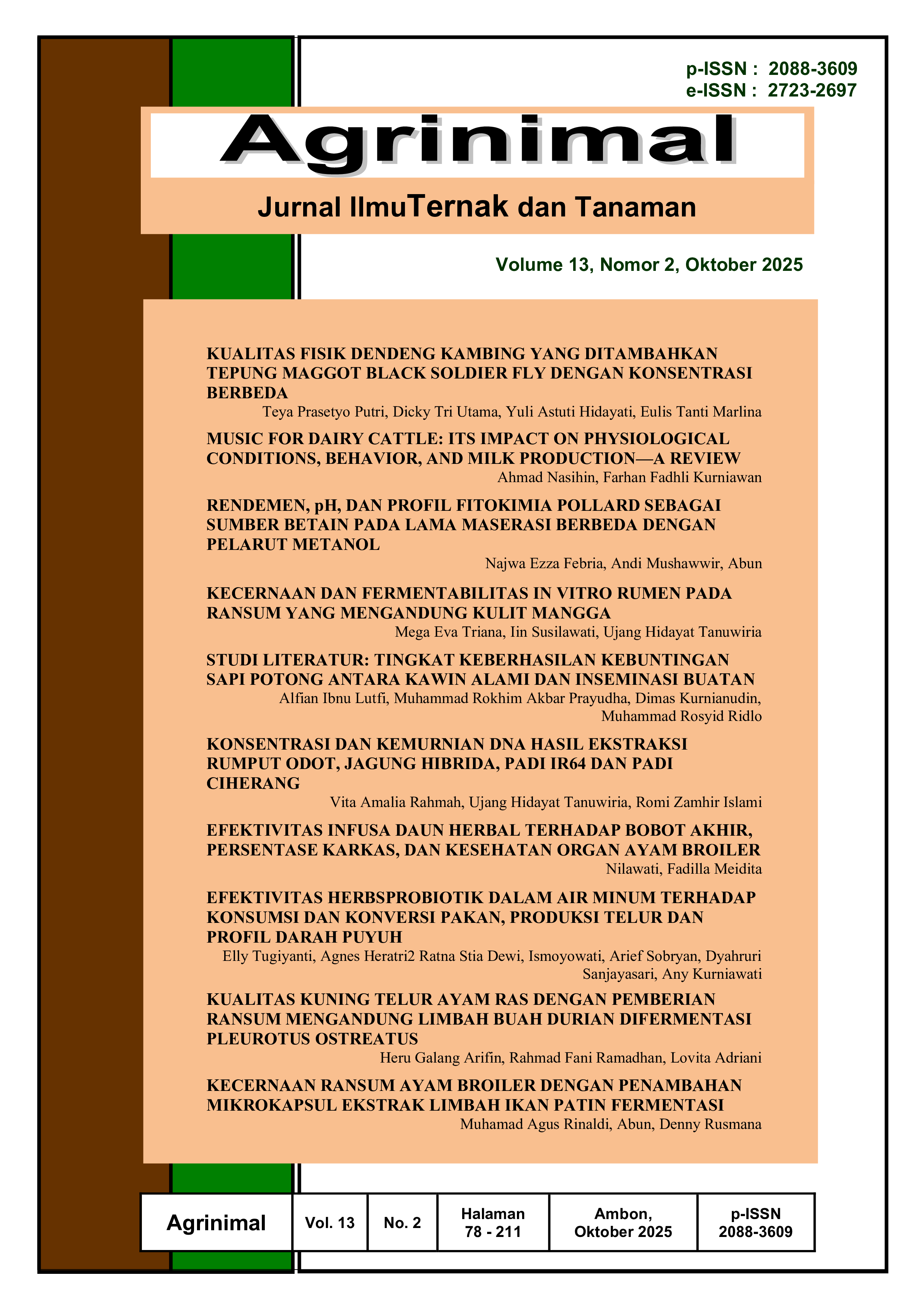 Ananda, R., Johan, H., & Ruyani, A. (2024). Pemberian pakan sampah buah dan sayur terhadap pertumbuhan dan kadar protein maggot bsf ( Hermetia illucens ). Jurnal Ilmu Nutrisi Dan Teknologi Pangan, 22(1), 43–49. https://doi.org/10.29244/jintp.22.1.43%E2%80%9149