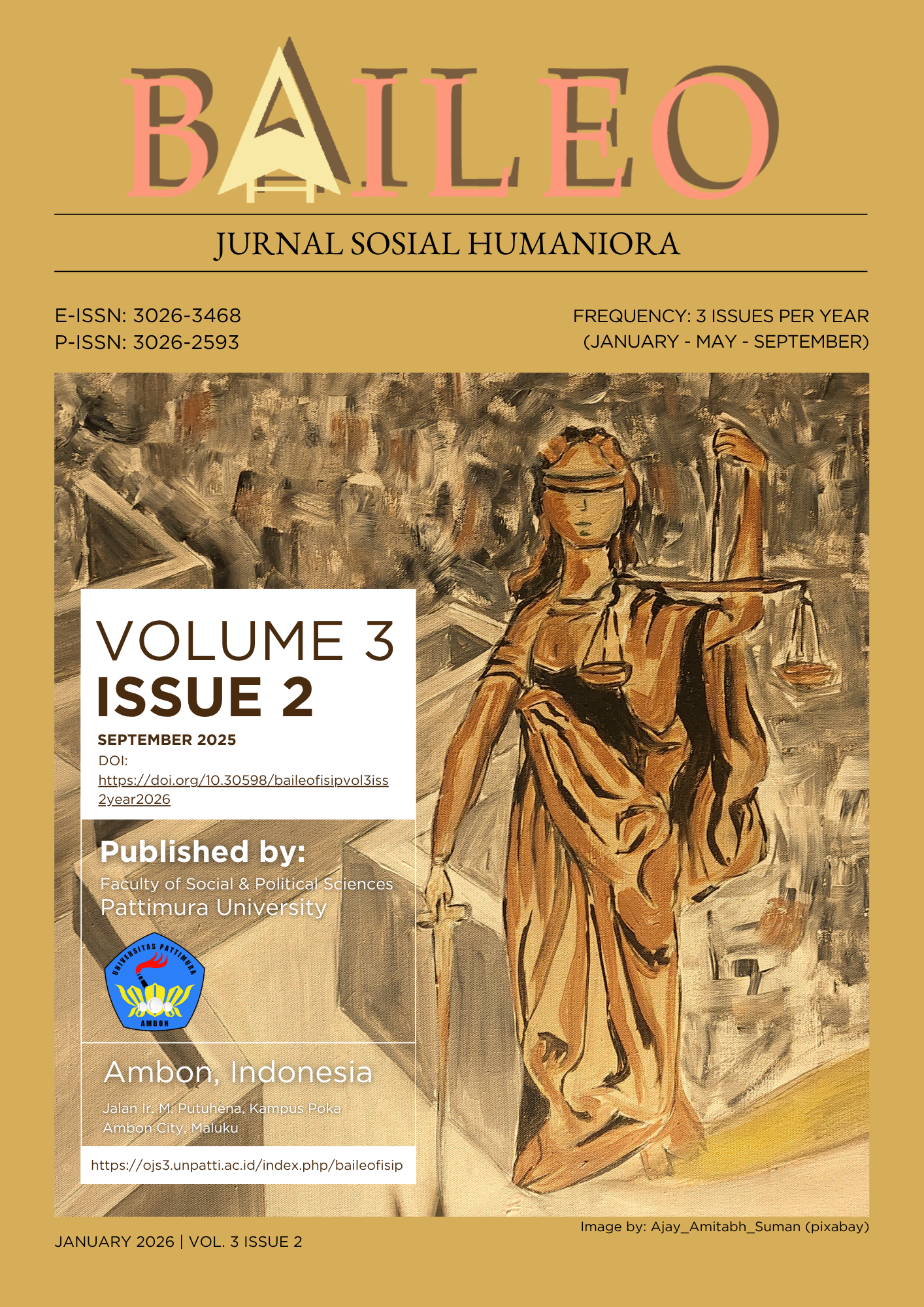Vol 3 No 1 (2025)The September 2025 edition of Baileo: Jurnal Sosial Humaniora presents a diverse range of interdisciplinary studies highlighting social, cultural, economic, legal, political, and educational dynamics within local, national, and global contexts. This volume brings together 16 scholarly articles contributed by 44 authors from four different countries: Indonesia, the Philippines, Liberia, and Guinea.