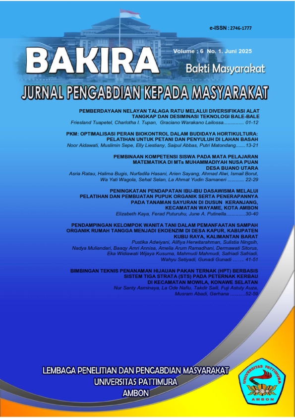 Bakira Journal is a journal of Community Service in Pattimura University. In the local language, Bakira means hurrying or appliying the knowledge immediately, so there will be an enhancement of knowledge and skill in the community and be useful. Bakira journal covers all fields of science (agriculture, fisheries, law, engineering, social and political science, basic science, education and medicine). The Bakira Journal will be published twice a year. The first publication began in June 2020 and the second publication in December 2020.
