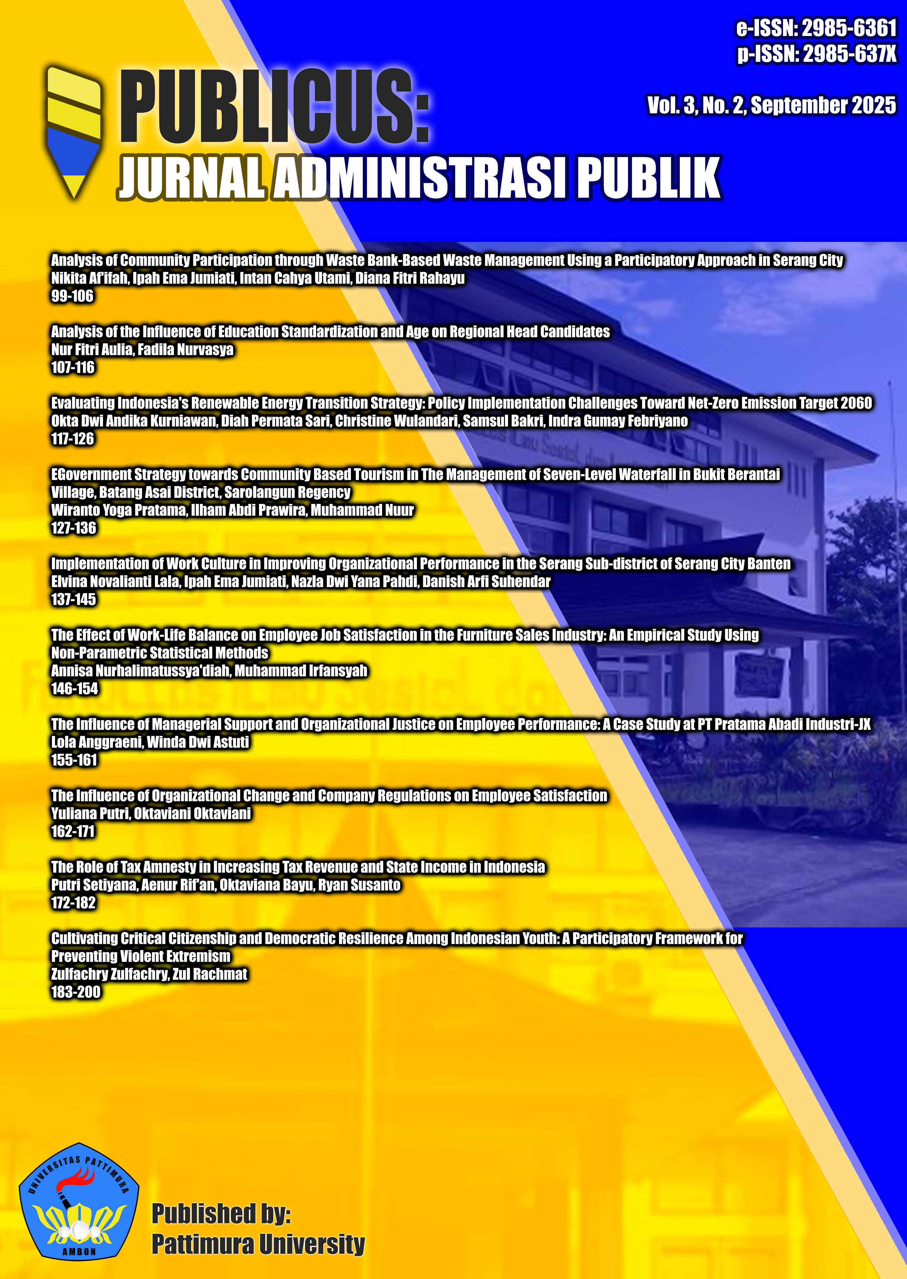 PUBLICUS: Jurnal Administrasi Publik stands as a distinguished academic publication under Pattimura University's Faculty of Social and Political Sciences, serving as a premier platform for advancing public administration scholarship. Published biannually in February and September, this journal maintains rigorous academic standards while fostering innovative discourse in public administration science. The journal welcomes diverse scholarly contributions including theoretical analyses, comprehensive literature reviews, and empirical research findings. PUBLICUS is committed to facilitating in-depth exploration of contemporary public administration challenges and solutions, making it an essential resource for academics, practitioners, and policymakers. Our comprehensive scope encompasses critical areas of public administration: Public Government dynamics, Public Organization management, Public Policy formulation and implementation, Public Service delivery excellence, Public Management strategies, Bureaucratic Ethics frameworks, Administrative Law and Government regulations, State and Regional-Owned Enterprise management, and State Apparatus Resource optimization. PUBLICUS serves as a bridge between theoretical knowledge and practical application, encouraging scholarly dialogue that influences public administration practice. The journal's mission extends beyond mere publication—it aims to cultivate a vibrant academic community dedicated to improving public governance and administrative effectiveness. By maintaining international publication standards while addressing local and regional contexts, PUBLICUS contributes significantly to the global body of public administration knowledge, positioning itself as an authoritative voice in the field.