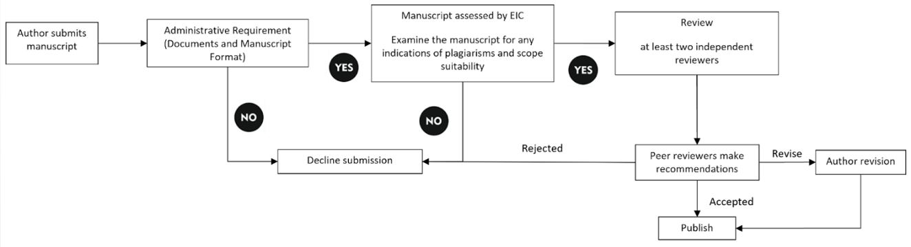 - Manuscripts are arranged into several sections, composed of: a) Introduction: Background, problem identification, research objectives, and research benefits. b) Materials and Method: Description of tools and materials in the research, work procedures, and analysis carried out. c) Results and Discussion: Contains research results or analysis results, and can be divided into several sub-sections. d) Conclusion: written at the end in paragraph form or separated and numbered. e) Authors Contribution describes all author role in the research or the manuscript preparation. f) Acknowledgments (if any): Contains acknowledgments to individuals, institutions or heads of institutions who played a role in completing the journal manuscript. g) References: can be sourced from books and scientific articles such as journals or proceedings, and it's managed by using references software manager (like Mendeley, EndNote, Zootero or compatible software).